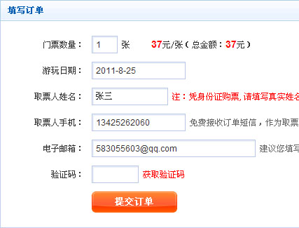 请填写真实取票人姓名、数量、证件类型内请选择预订人有效证件类型,手机号码请填写取票人手机号码,E-mail下是可选填写,填写结束后提交订单。(注:带*号为必填项)
