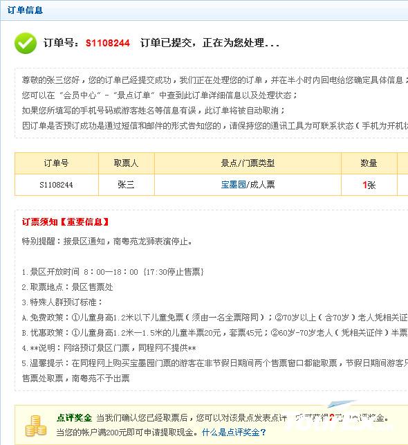 提交订单后,表示您的订单已提交至本网,请直接凭收到的手机短信前程景区指定取票点取票入园游玩。