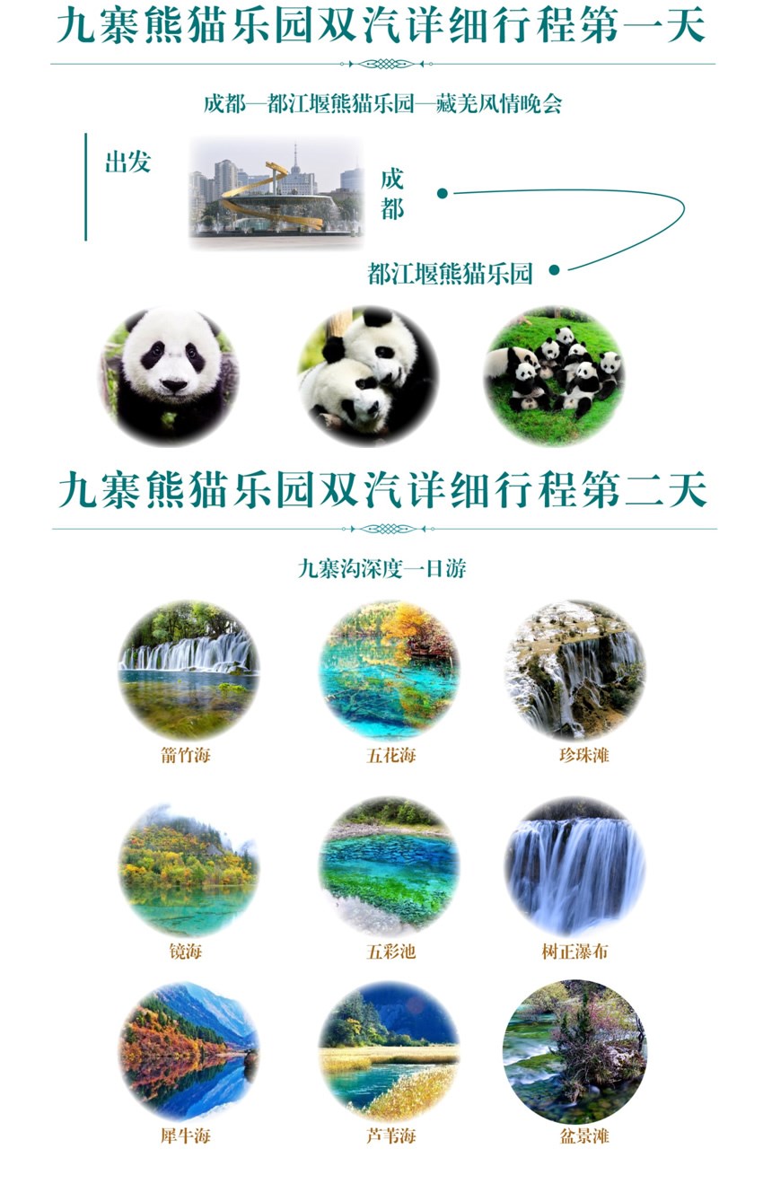 早晨成都统一地点集合08:00出发,途经都江堰,约09:30左右到达熊猫乐园参观游览【游览时间约1.5小时】,与大熊猫亲密接触后前往都江堰品尝四川名小吃,12:30分左右出发,经汶川、茂县、松潘,车观松潘古城,后途中参加赠送项目品尝藏式土火锅】品尝手抓肉及爽口的青稞酒、酥油茶 (赠送项目不参加不退费)【时间约1小时】。约20:00左右抵达九寨沟入住酒店,享用酒店晚餐。