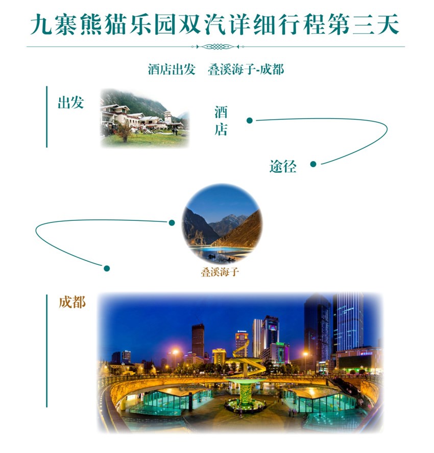早上酒店享用丰富的早餐后出发前往素有人间瑶池美誉的---黄龙风景区,旅行社精心安排的错峰游让您畅游黄龙,保证游览时间为3-4个小时。景区黄龙沟的数千个钙化彩池形态各异,流光泛彩,长达2500米的钙化硫池是世界之最。沿途主要景点有洗身洞、金沙铺地、盆景池、黄龙洞、黄龙寺、石塔镇海、五彩池、转花玉池等。游览时请量力而行(可自费乘索道上下,上80/人,下40/人)。后驱车前往川主寺品尝主题定制餐—国宝主题宴。用餐后直接乘车安全返回成都,预计晚上21:00左右抵达。