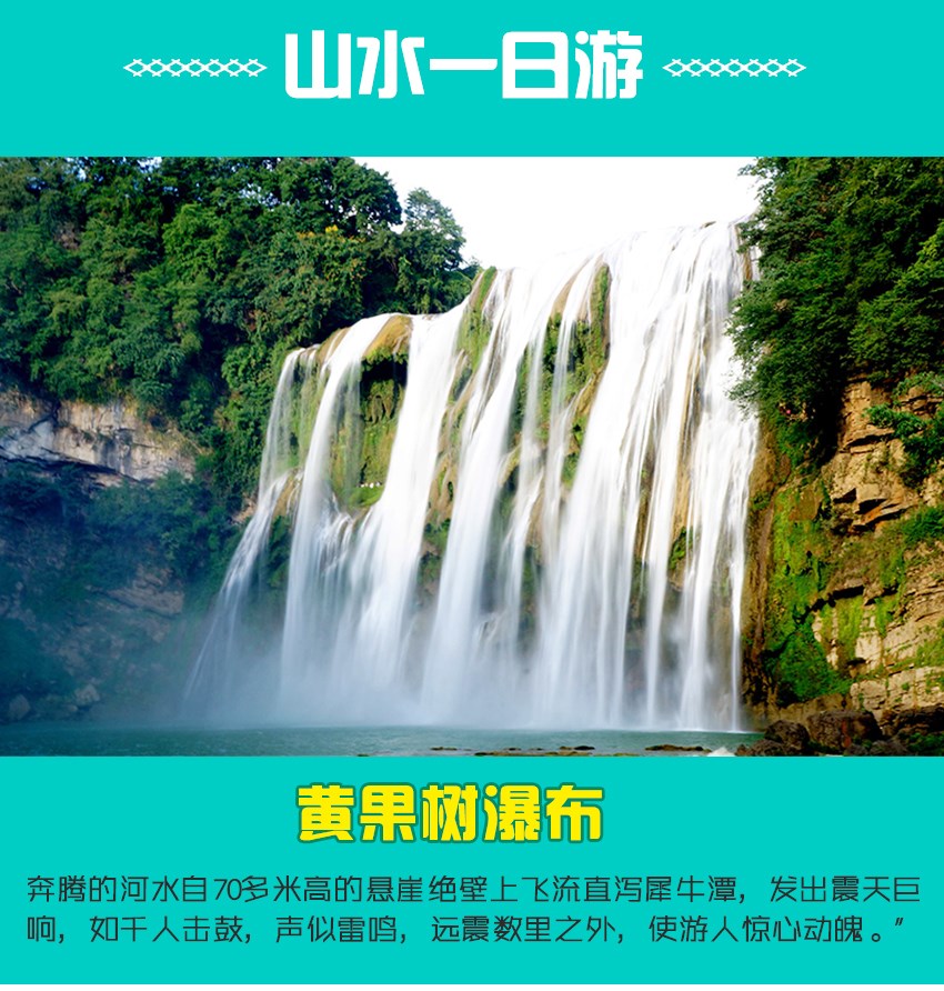 6:00-6:40左右全市发车站点(火车站大昌隆超市对面)集合上车。全程经贵黄高速公路(高速路上无突发事件,无堵车等情况)车程2小时左右抵国家5A级景区——【龙宫】(游览时间约1.5小时)。游览龙宫风景区,观龙门飞瀑,然后乘电梯(已含35元/人)至码头,乘船游览840米长的暗湖溶洞,洞中钟乳奇石林立,景观优美。11:00-14:00左右乘车赴黄果树景区享用中餐【途中参观珠宝、波波糖、乳胶(3选1)】,14:00—15:30餐后换乘景区环保车(已含50元/人),游览瀑布群最宽的【陡坡塘瀑布】游览时间:不少于1小时;这里也是唐僧师徒四人取经的必经之地;游览有绿色喀斯特、水上石林、天然盆景之称的【天星桥景区】游览时间:不少于1小时;游览【黄果树大瀑布】游览时间:不少于2小时;(注:不含上下扶梯单程30元/人往返50元/人;属景区内不必须自费项目,请客人自行自愿慎重消费)您可以从前后左右上下里外8个角度欣赏这个亚洲最大的瀑布,您也可以一路向上走进美猴王的府邸【水帘洞】,去找找黄果树名称的由来【黄角榕】,过铁索桥;您也可以在观瀑台寻找大瀑布最美的角度留影;参观结束后返程。21:30(左右)抵达贵阳,结束本次轻松美好、精彩难忘的探索贵州双5A之旅。