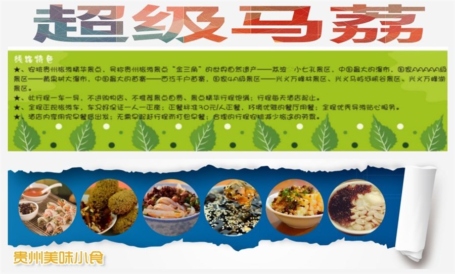景点:黄果树大瀑布;荔波小七孔;西江千户苗寨;马岭河峡谷; 万峰林;万峰湖;