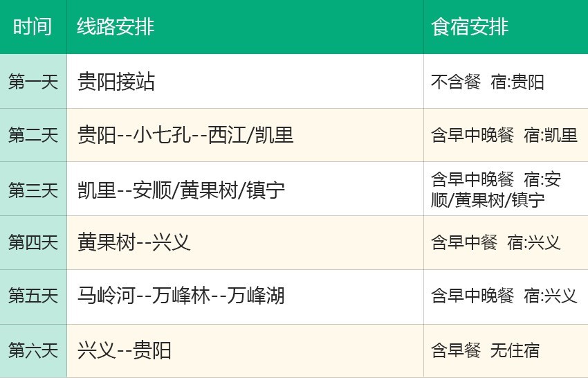 特别提示:当年11月至次年4月住西江,其它时间住凯里。如果安排住西江的话,西江整体住宿条件较差无星级标准,且单家客栈房间数量较少,一个散拼团有可能分几家客栈住宿,进入景区无行李车需要自行携带行李步行(10-20分钟)进入景区入住酒店。