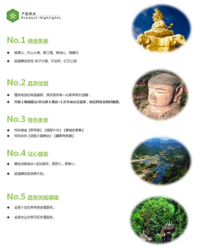 约12:00:前往餐厅享用川西特色美食餐【青城农家宴】(约30分钟)。约13:00:前往中国道教发祥地----世界文化遗产--【青城山风景区】(游览时间2.5小时)青城山景区停车场至青城山景区电瓶车(自理20元/人),从山门进入,拾级而上,经雨亭、天然阁、怡乐窝、引胜亭,便来到了天然图画坊或乘坐游船经月城湖(费用自理,往返10元/人)和索道至上清宫(费用自理,往返60元/人),天然图画坊位于龙居山牌坊岗的山脊上,是一座十角重檐式的清代亭阁;经山荫亭、凝翠桥、五洞天来到道教创始人张道陵结茅传道居住地——天师洞,原路下山,感受青城空翠四合,峰峦、溪谷、宫观皆掩映于繁茂苍翠的林木之中。道观亭阁取材自然,不假雕饰,与山林岩泉融为一体的青城之“幽”看尽山间不同年代、不同风格的道教宫观,领略道家的文化魅力。
